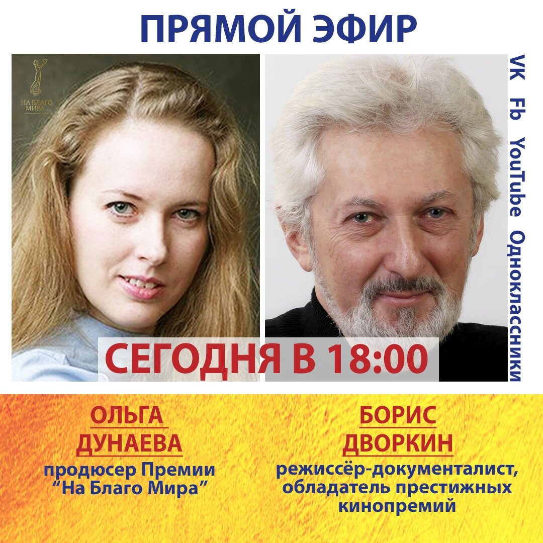 Друзья! Сегодня у нас в прямом эфире Борис Дворкин - режиссёр-документалист, обладатель престижных кинопремий.