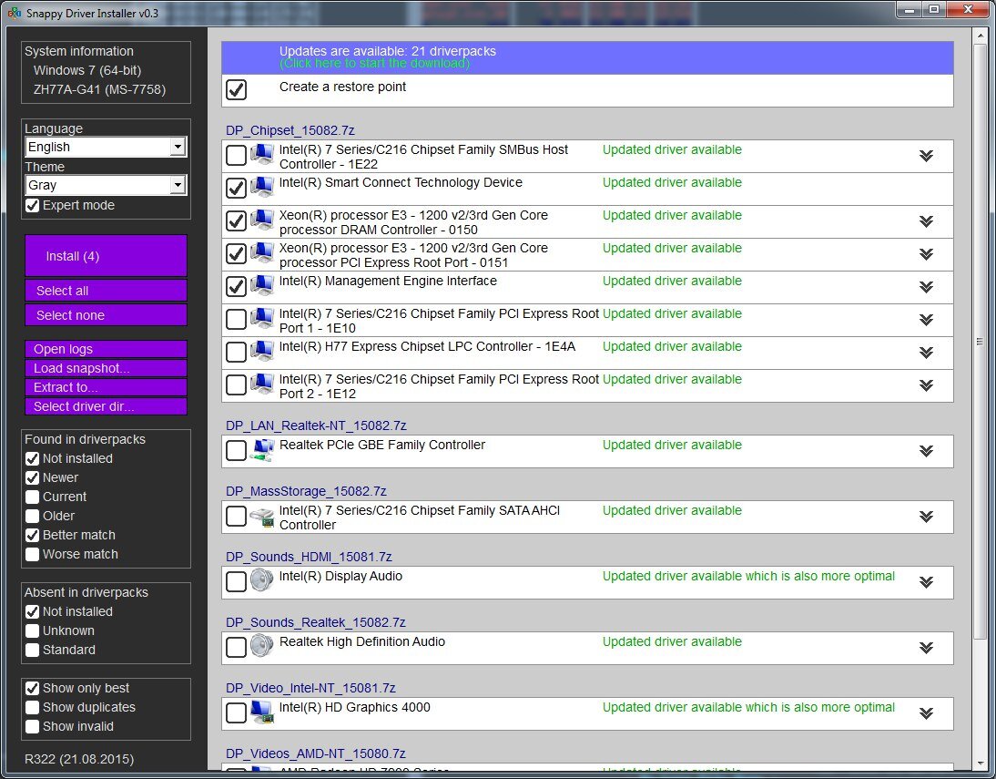 По завершении скачивания заходим в папку, куда вы его сохранили и запускаем. Тут важный момент - если у вас 64-разрядная операционная система, запускаем SDI с припиской x64, если 32-разрядная, запускаем SDI без этой приписки. Напоминаю, что посмотреть разрядность системы можно через свойства ярлыка Компьютер. В моём случае система 64-разрядная и я запускаю SDIх64. В появившемся окне разрешаем доступ к компьютеру нашему сборнику драйверов. Далее лично я всегда выбираю тему Дарк, так как тема по-умолчанию шибко пёстрая и напрягает меня. Далее выставляем галочку на Точку восстановления и выбираем необходимые нам драйвера. Большинство из них, пока мы скачивали SDI Windows уже поставил в фоновом режиме самостоятельно, однако, как мы видим, имеется пара красных строчек, а значит эти драйвера не установлены - выбираем их. Далее опускаемся ниже и ищем драйвера с пометкой DP_Sounds - раздаём им галочки. Это нужно для того, чтобы у нас были полноценные драйвера на звук, Виндовс же, как правило, ставит урезанные. Идём дальше и видим драйвера с пометкой DP_Video. Замечаем, что у нас таких строчки две - одна Интел, а вторая Нвидиа. Так же у вас могут быть варианты АМД и АМД Радеон. Запоминайте простое правило - Интел и АМД без приписки Радеон это встроенные видеокарты, а НВидиа и Радеон дискретные, то бишь игровые. На встроенные видеокарты можно смело ставить галочку в SDI, а вот на игровые я бы рекомендовал скачивать максимально полноценные с сайта производителя - далее я покажу, как это сделать, а пока устанавливаем выбранные драйвера.