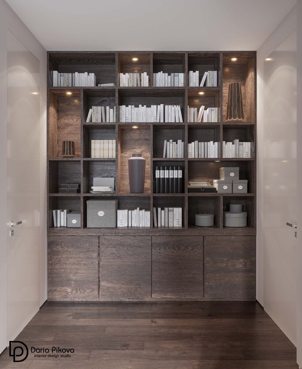 Книжные шкафы закрытого типа обеспечивают более правильные условия хранения литературы, а также блокируют беспорядок на полках. Однако и пространство тоже сужают. Я рекомендую обычно часть книг – самых красивых – собрать на открытых местах для хранения, а менее симпатичные спрятать за фасадами. Так и ощущение книг в доме сохранится, и бардака не будет.