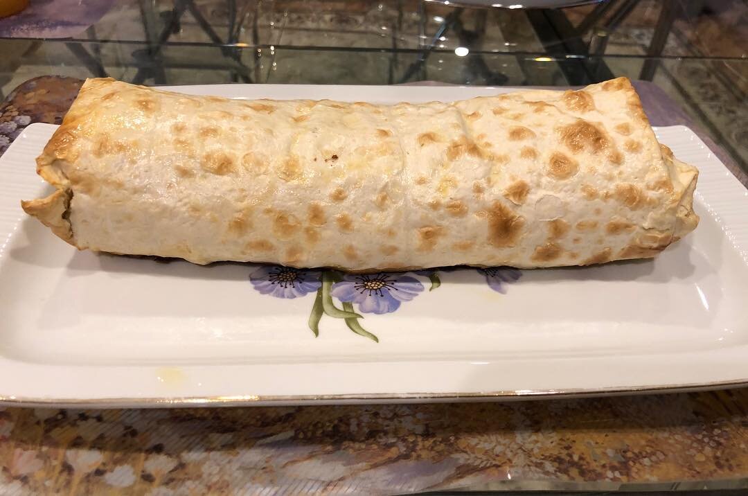 Лист армянского лаваша смазать двумя -тремя столовыми ложками смеси из 2 яиц и двух столовых ложек сметаны. Сверху присыпать слоем твёрдого тёртого сыра ( тереть на крупной тёрке). Мясная начинка: 1 луковица -мелко нарезать и потомить на оливковом масле на сковороде. Когда лук готов, добавить туда 400 гр мясного фарша, перемешать, слегка обжарить, добавить соль и специи по вкусу, а также