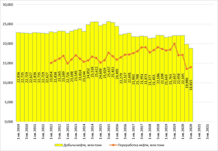 По сравнению с 3 кв. 2019 года добыча нефти снизилась на 15%.