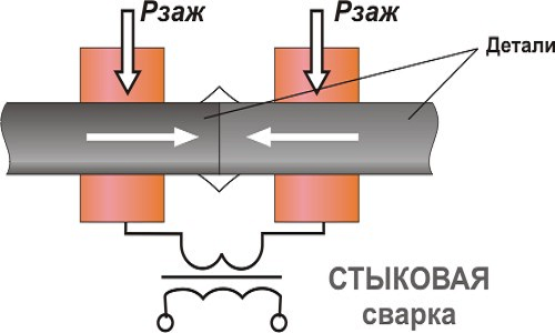 - Способ сопротивления, который применяется для деталей, площадь сечения которых не превышает 200 мм2, обычно это проволока, тонкие трубы. Сущность такого процесса заключается в том, что через зажимные электроды подается электрический ток и на месте стыка двух деталей металл становится мягким и пластичным, но не расплавляется, а детали в это время прижимаются друг к другу и питание отключается, в результате под действием большого давления получается шов. Все действия выполняет запрограммированная машина. Недостатками данного способа является то, что заготовки необходимо предварительно подготовить, убрать все неровности, тщательно отшлифовать, удалить все окислы, чтобы конструкция получилась жесткой и прочной;