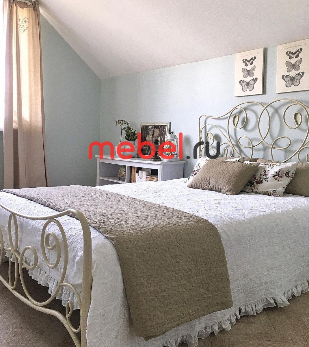 Ещё одна современная адаптация Прованса. Комод и шкаф с успехом вписались бы и в сканди. Тон задаёт декорация над кроватью, кованое изголовье, обои и декор.