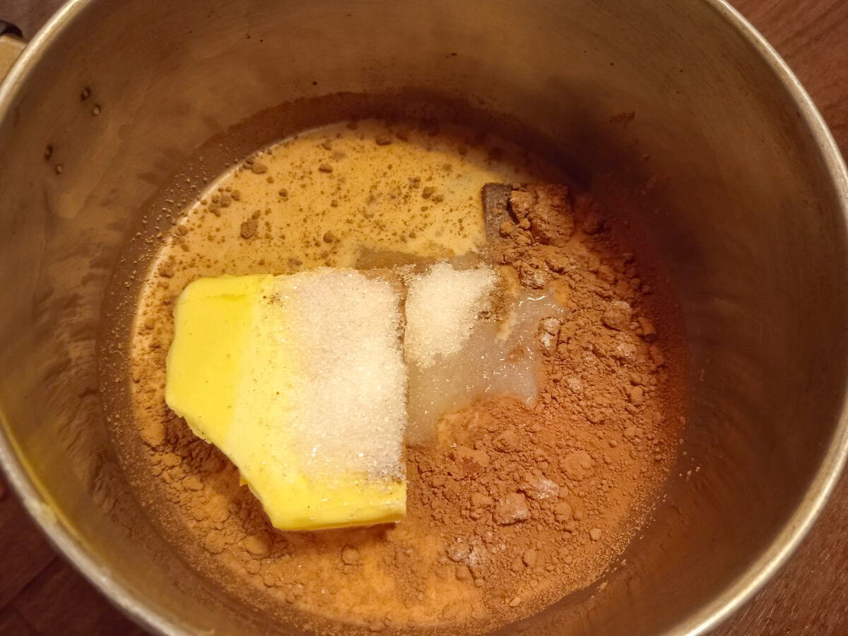 Первым делом нужно помешивая довести до кипения 60г сахара, 70г сливочного масла, 50мл молока, 30г горького шоколада и одну столовую ложку какао.