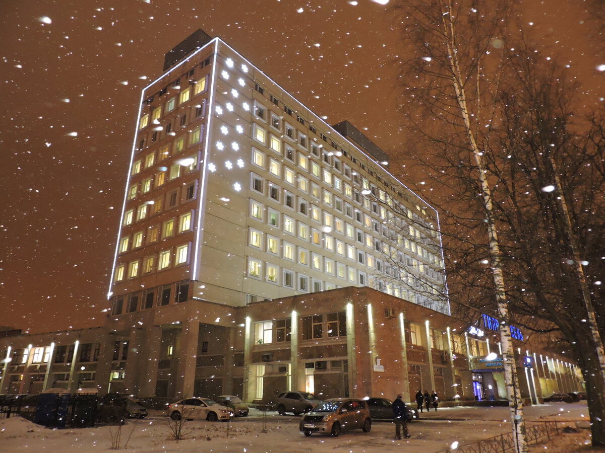 Изнутри это многоэтажное здание пронизано длинными коридорами, перегороженными несколькими распашными стеклянными дверьми. По бокам - нескончаемые двери кабинетов. Даже днем вся эта "красота" производит довольно гнетущее впечатление. А уж ночью там откровенно жутко. Ночная смена охраны регулярно делает обход этих длинных темных коридоров с фонарями. Люди, проработавшие там несколько лет, уже вполне привыкли к звукам шагов и невнятному бормотанию, которые каждую ночь слышны в коридорах и на лестницах. А новички пугаются будь здоров. У них даже есть такой вроде обряд посвящения, после которого посвященного иногда приходится приводить в чувство коньяком. Сильные духом остаются.