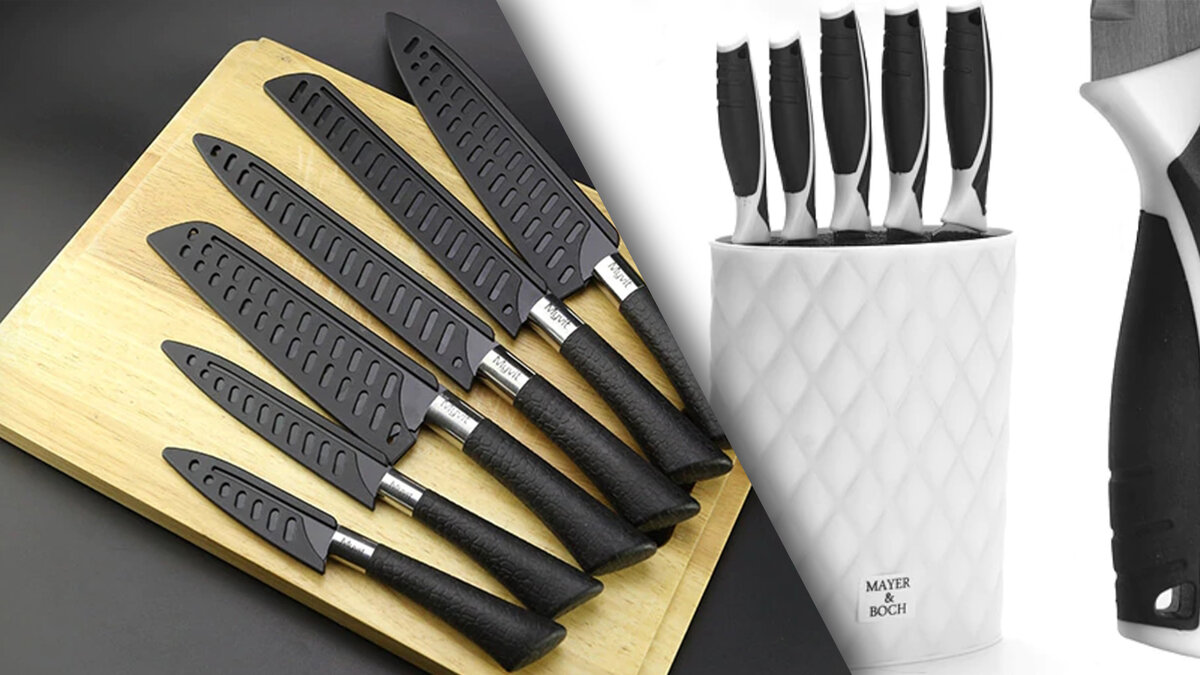 Пожалуй, самый популярный комплект недорогих кухонных ножей на AliExpress. Ножи выглядят красиво для своей цены: рукоять из фактурного пластика, клинок покрашен в чёрный.