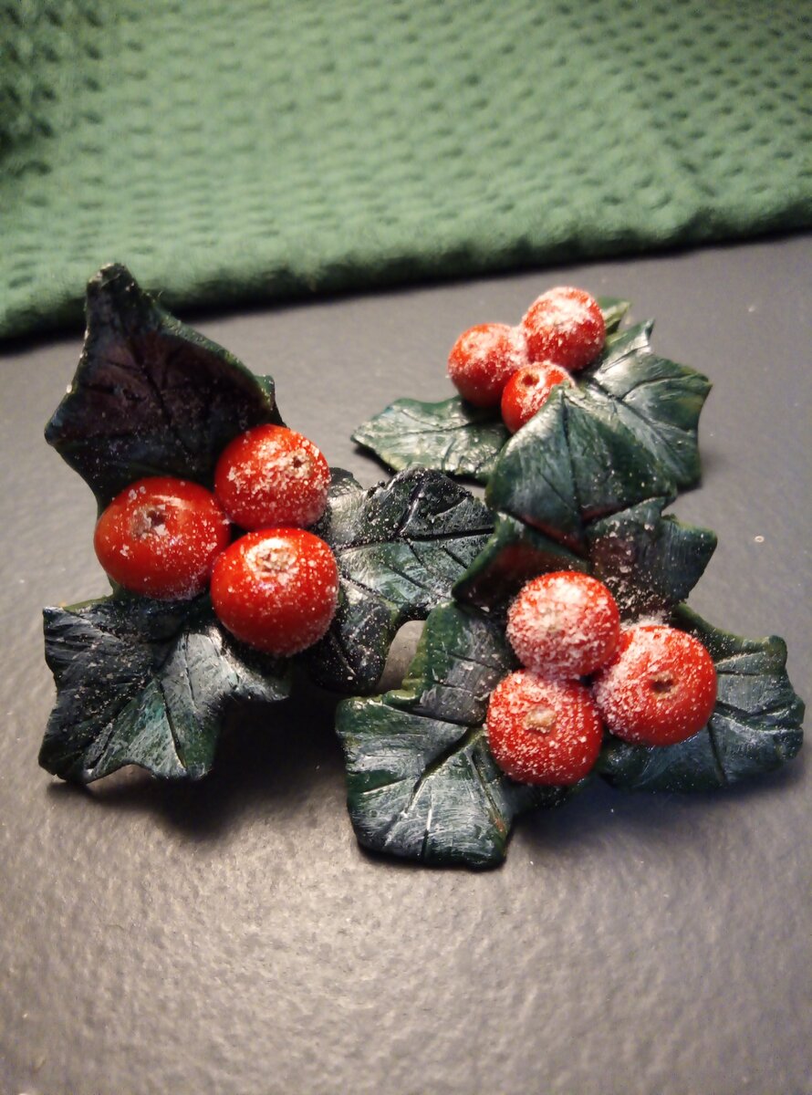 Теперь из зеленой глины,при помощи скалки для лепки раскатаем плоский лист.Из него мы вырежем листочки для наших ягод.Будут ягоды рябины и остролиста,и листиков тоже будет два