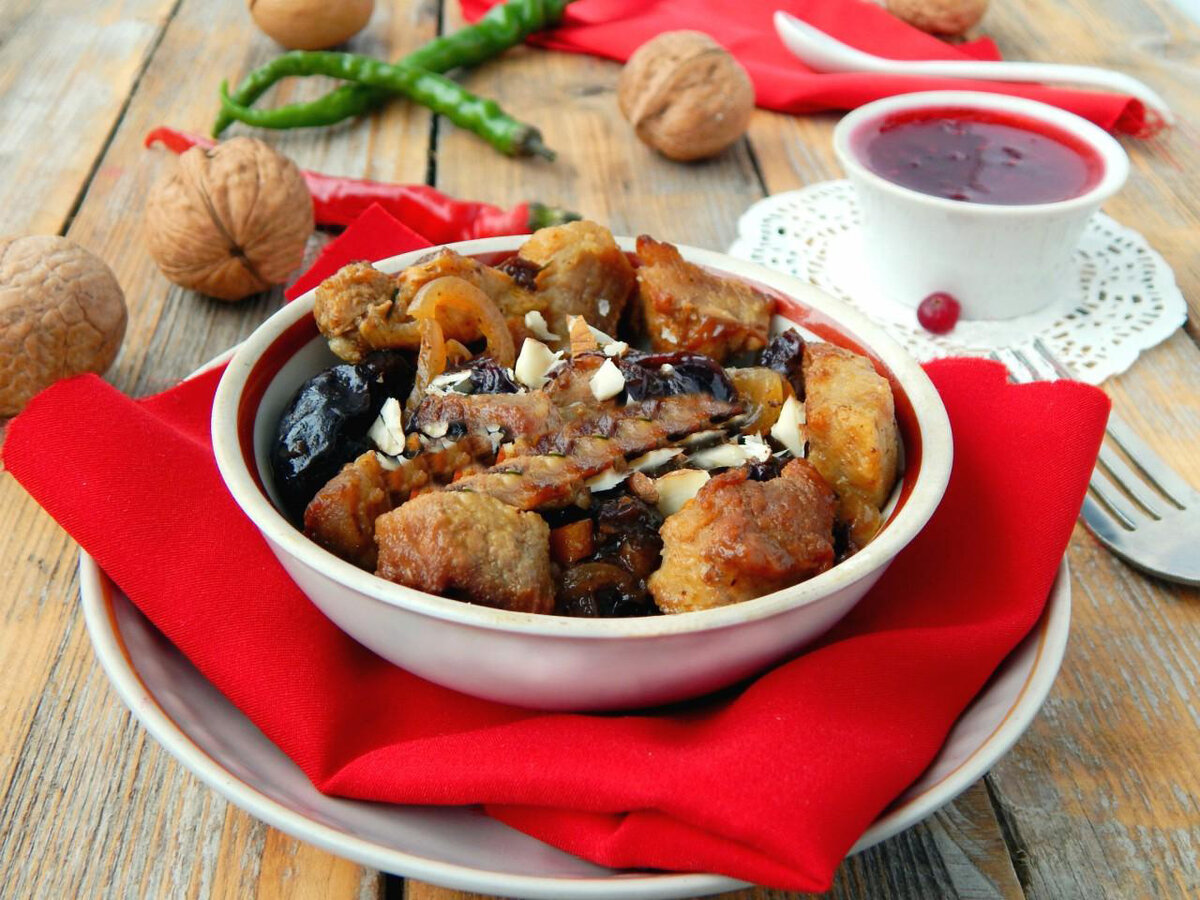 - Шаг 9 - Отправляем на сковороду к мясу чернослив, вливаем немного воды. Добавляем соль, черный молотый перец. Тушим их вместе на медленном огне около 40 минут. Затем отправляем на сковороду припущенный репчатый лук и грецкие орехи (горстку орешков нужно оставить для подачи). Тушим еще около 10 минут. Жидкость почти полностью должна выпариться. Подаем говядину с черносливом, посыпав сверху измельченными грецкими орешками, с клюквенным соусом.