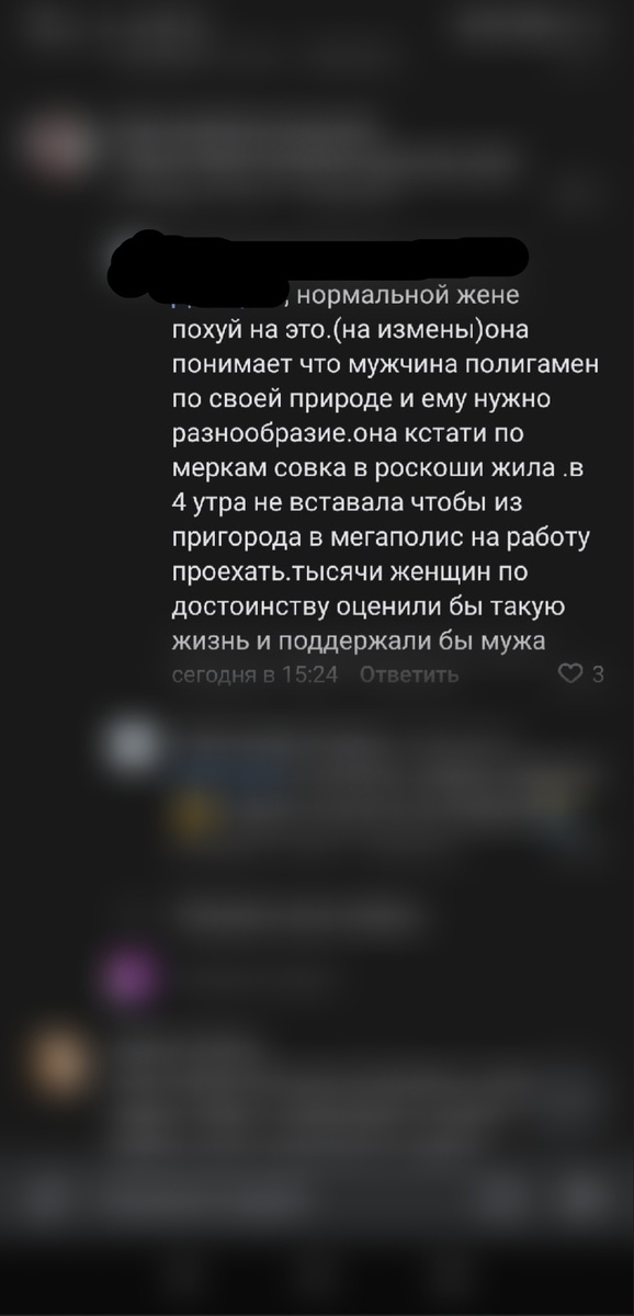 Также оказывается, что если семья живут с изменами, то это абсолютная норма. Любое отклонение приравнивается к желанию получения денег и хайпа со стороны женщины.