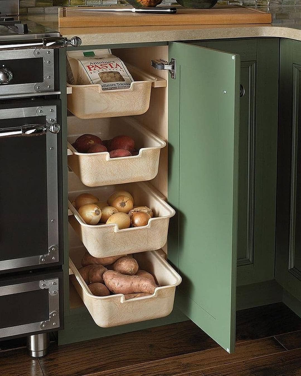 25. Если кухня узкая, можно немного пожертвовать глубиной верхних шкафчиков ради того, чтобы не биться о них головой. В этом случае разумно встроить вытяжку в столешницу.