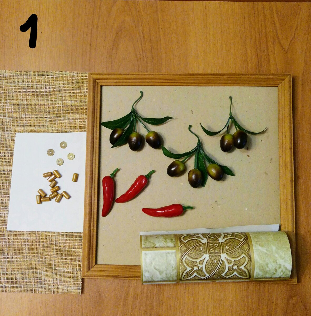 1. Для работы нам понадобятся: рамка для фото деревянная 25х25см. Ткань рогожка (у меня салфетка имитация рогожки), искусственные веточки оливы и перцы чили. Деревянные бусины и декоративные монетки, обрезы обоев, клеевой пистолет.