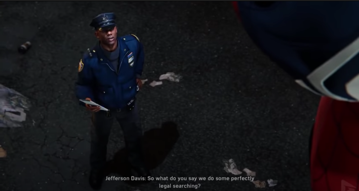 После начала расследования нам в помощь дают сотрудника полиции, Джефферсон Девис, отец Майлза Моралеса.