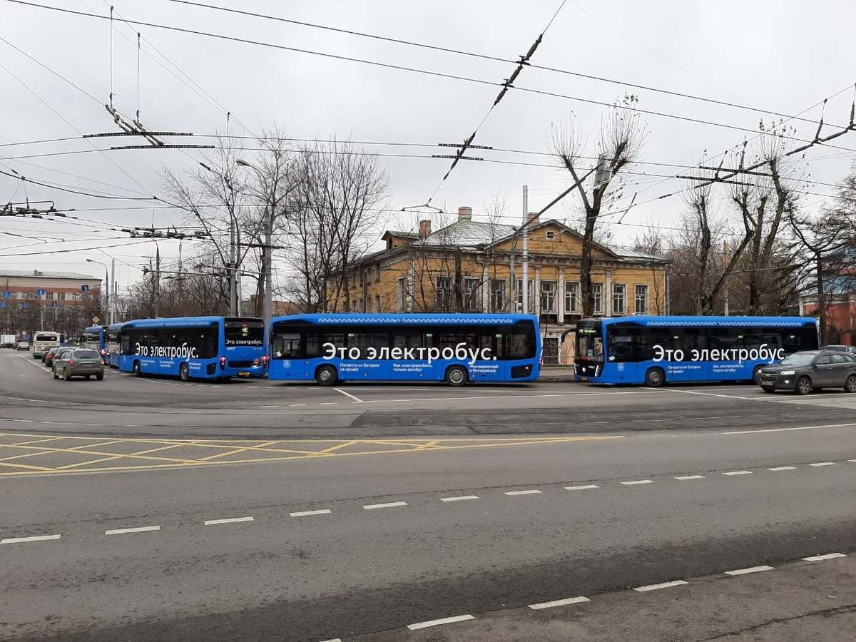 Но уже на следующий день в сообществе "Синие ведёрки" появился вот такой кадр. Снова "кратковременный технический сбой" уже на конечной "метро Озёрная". Электробусы магистральных маршрутов М4 и М17 вместо того, чтобы возить пассажиров, стоят в очереди на покушать. Пассажиры, мёрзнущие на остановках в этот момент, должно быть, очень рады инновационным технологиям.