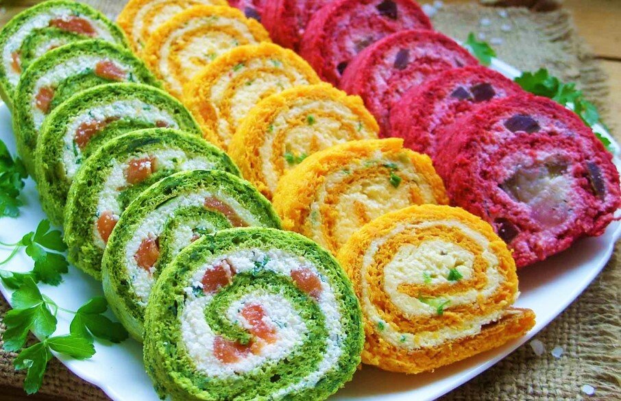 Для первого рулета используйте замороженный шпинат, для второго - морковь, для третьего - свеклу.
