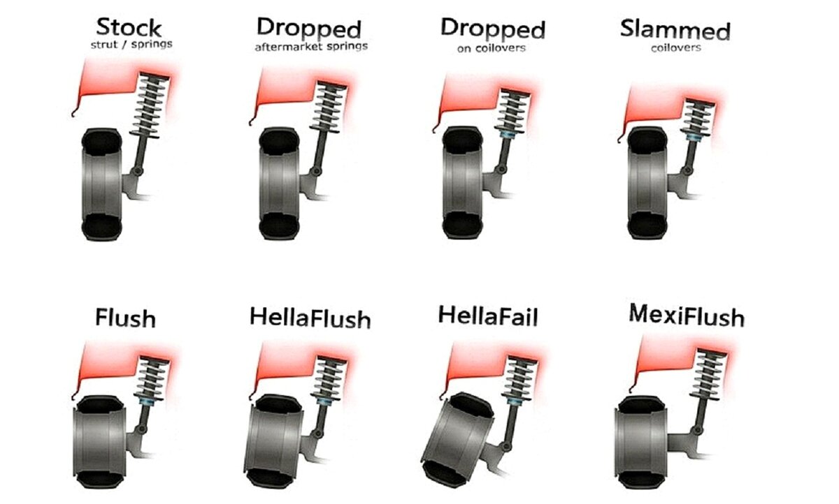 «HellaFlush» — один из радикальных способов доработки подвески. В данном варианте максимально близко к кромке крыла находится диск, причём в двух плоскостях обозрения. В наиболее жёсткой конфигурации пружинной подвески кромка арки нависает над ободом диска всего в нескольких миллиметрах, необходимых для избегания контакта при работе пружин. В случае с пневматической подвеской зазор может и вовсе отсутствовать – арки в неподвижном положении автомобиля ложатся на диски. Резина в этом варианте устанавливается гораздо меньшей ширины, чем та, на которую рассчитаны диски. Образовавшийся вследствие этого «натяг» позволяет спрятать шину за колёсную арку, что, в свою очередь, позволит сделать автомобиль более приземистым.