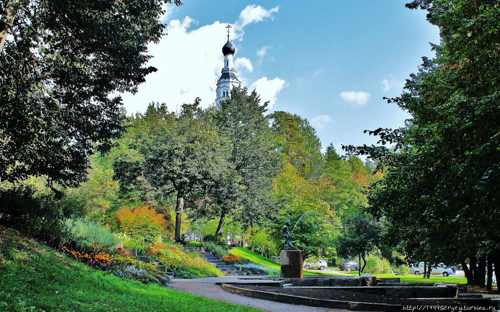 В пригороде Санкт-Петербурга в живописном сосновом бору на берегу Финского залива расположился небольшой курортный городок Зеленогорск. Мы часто его посещаем. Как правило, поездка занимает день, но иногда лишь несколько часов. Однако нехватку времени стараемся компенсировать. Всего несколько часов – много это или мало? Думаю, на этот вопрос ответит лучше сам замечательный город. Удивительно, но каждое свидание с Зеленогорском несёт в себе что-то новое, интересное, как, например, в тот обычный погожий сентябрьский день.А началась та короткая прогулка у фонтана. В небольшом сквере имени Восьмого Марта, что рядом с Приморским шоссе, в гуще старых деревьев виднеется бронзовая фигурка маленькой девочки. Если подойти ближе, то можно заметить, что девочка не одна, компанию ей составляет огромная рыба. Схватив за жабры, ребёнок пытается вытащить её на берег, однако хозяйка водной стихии так просто не сдаётся. Рыбина из последних сил упирается, а из разинутой пасти с шумом, но лишь на время сезона эксплуатации фонтана, вырываются в разные стороны брызги. Впрочем, вряд ли девочка отпустит свою добычу, ведь она не простая, а удэ девочка. Удэ или удэгейцы – это коренной малочисленный народ, проживающий по берегам Уссури и Амура. Возникает вопрос, а как смогли дальневосточная рыба и маленькая девочка добраться до берегов Балтики? Ответ на вопрос знает Персидская, Екатерина Николаевна, художник и скульптор. Будучи в составе экспедиции, она в начале XX века посетила родину удэгейцев — Уссурийский край, а позже создала ряд работ на эту тематику, в том числе и бронзовую «Удэ девочку с рыбой». В 1957 году, когда Северная столица торжественно отмечала свой 250-летний юбилей, фонтан открыли. Тогда он выглядел иначе, было больше воды. Исчезнувшие сегодня каменные вазы, окружавшие когда-то девочку и рыбу, фонтанировали. Вода струилась каскадами. Сейчас лишь можно догадываться, какими она бурлили потоками в сквере Восьмого Марта.От девочки с рыбой рукой подать до другой достопримечательности Зеленогорска – действующего храма Казанской иконы Божьей Матери. Собор был возведён в начале XX века и ныне является памятником архитектуры федерального значения. Однако сегодня мы к нему не пойдём, оставим для другого дня, а вместо этого посетим парк Культуры и Отдыха.Следуем этой тропинкой.По пути попадается павильон Блинный домик.Затем выходим на пересечение Приморского шоссе с проспектом Ленина. Здесь нас встречает монументальная, выполненная в полный рост, фигура вождя мирового пролетариата. Величественное здание у Комсомольского сквера, на фоне которого высится Ильич, это средняя общеобразовательная школа-лицей №445. Помните, что завещал нам когда-то дедушка Ленин? «Учиться, учиться и ещё раз учиться…». Однако жестом учитель указывает вовсе в другую сторону, в городской парк Культуры и Отдыха. Значит, нам туда дорога.Сразу при входе в парк обнаруживаем цветущую клумбу в обрамлении круглой скамейки и необычный памятник. Это молодой человек в облегающем сюртуке и с тростью в руках. Он явно куда-то торопится, при этом успевает отвесить кому-то поклон. Как знать, может он здоровается с Лениным? Конечно же, нет. Бальзаминов, а именно его мы встречаем в парке, персонаж другой оперы. «За чем пойдёшь, то и найдёшь» — так называлась пьеса русского драматурга второй по
