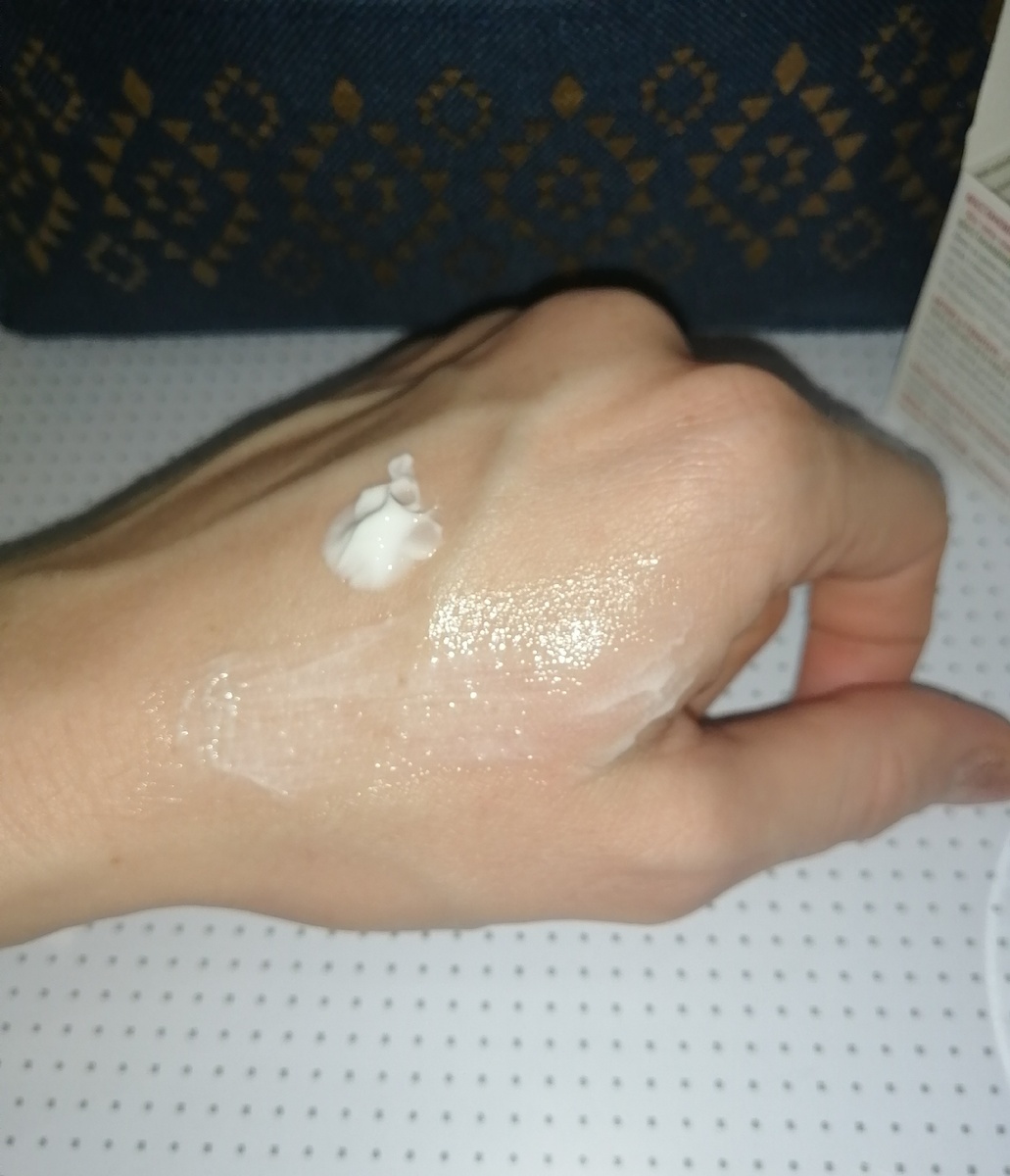 Запах приятный, а по структуре не слишком плотный. Ложится на кожу хорошо, сначала кажется жирноватым, но быстро впитывается. И что мне понравилось сразу - крем аллергию не вызвал, хотя кожа реагирует на неподходящие средства мгновенно, и лицо хорошо увлажнилось. Я почувствовала ощущение комфорта и нежности.