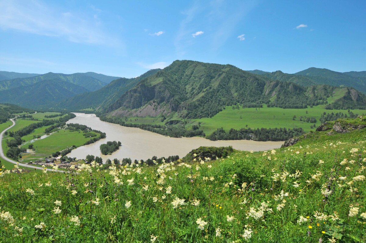 Изгибы русла Катуни называют в народе «подковами». Здесь как раз и открывается вид на очередную «Катунскую подкову» с изгибом к востоку. Чуть дальше этого места, ниже по Катуни, она – река делает западный изгиб, который в народе называют «Чемальской трубой». А если смотреть по Катуни на север, то в ее русле лежит «стрела Сартакпая».