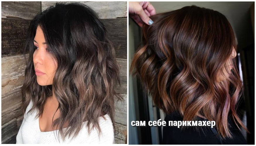 Темный прекрасно сочетается с чуть более светлым ореховым оттенком. Здесь мы видим и частичное мелирование и балаяж с акцентом на кончиках волоса.