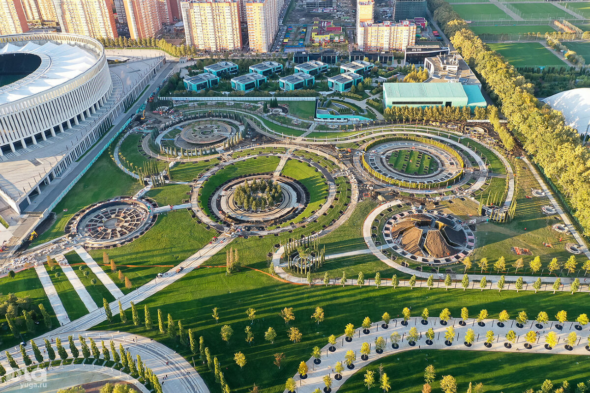 Парк примыкает к стадиону «Краснодар», который также был построен на средства миллиардера. Внутрь попасть не удалось, но архитектура и отзывы о стадионе отличные. Что характерно, такой классный стадион и Краснодар в целом не будут принимать игры Чемпионата по футболу в этом году, но сборная какой-то страны будет здесь жить и тренироваться.