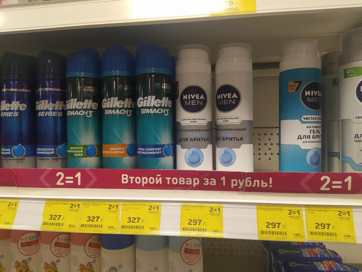 Пены и гели для бритья в ассортименте(Nivea, Gillette) 2 по цене 1. Мужу очень нравится гель для бритья Nivea для чувствительной кожи.