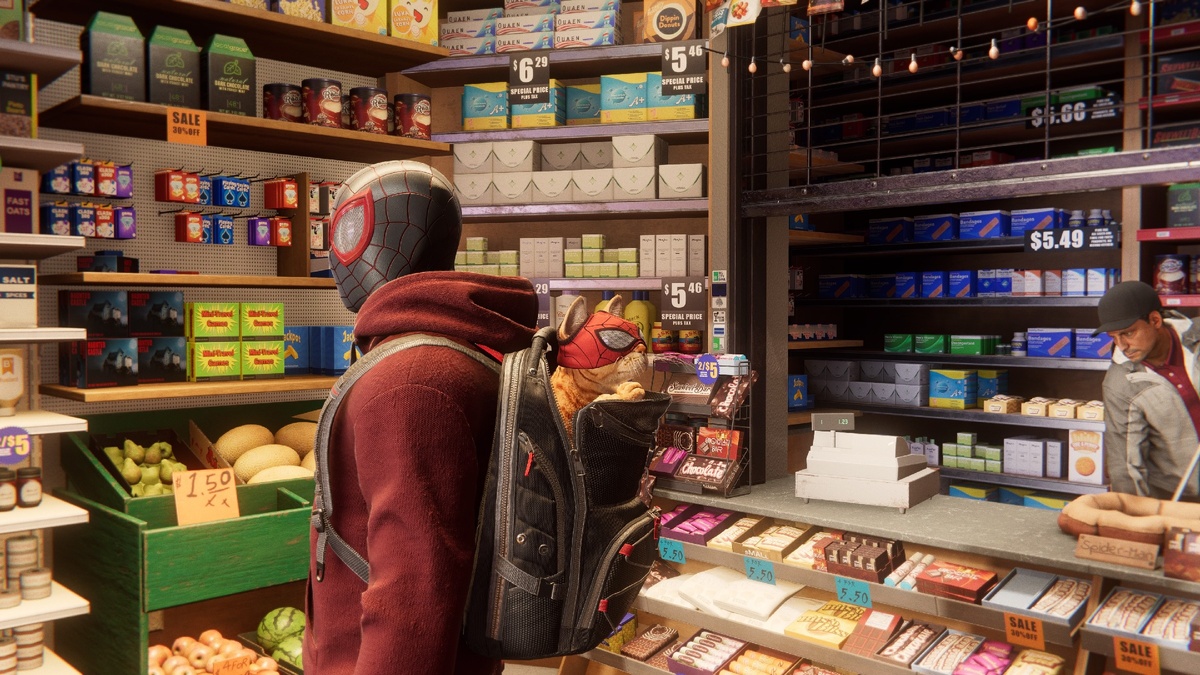 Самый классный костюм при первом прохождении, увы, не получить: в одном из ранних побочных квестов Моралес находит украденного рыжего кота по кличке Человек-паук, а после спасения Гарлема от всех угроз может взять его с собой в качестве напарника — костюм включает в себя толстовку и рюкзак со Спайди-младшим. Помимо особых анимаций добивания, где рыжий Паучок бьет супостатов по мордам со всех четырех лап, он еще и делает игру куда приятнее. Например, в одной из первых напряженных кат-сцен перед битвой с Носорогом Майлз предельно сосредоточен и серьезен. Но если у вас будет экипирован нужный костюм, в этот момент из рюкзака за спиной вылезет кот и начнет пытаться ловить снежинки лапами, громко при этом мяукая. Милота.