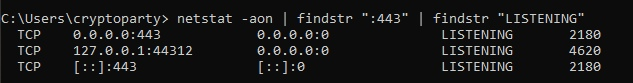 netstat -aon | findstr ":443" | findstr "LISTENING"