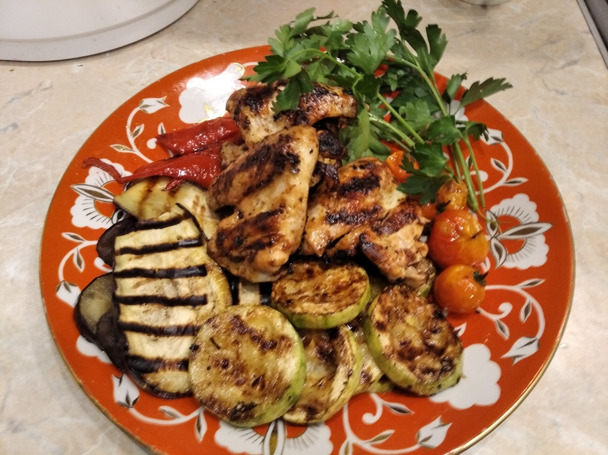 Куриные крылышки-гриль с овощами. Приготовлены на кухне без мангала.