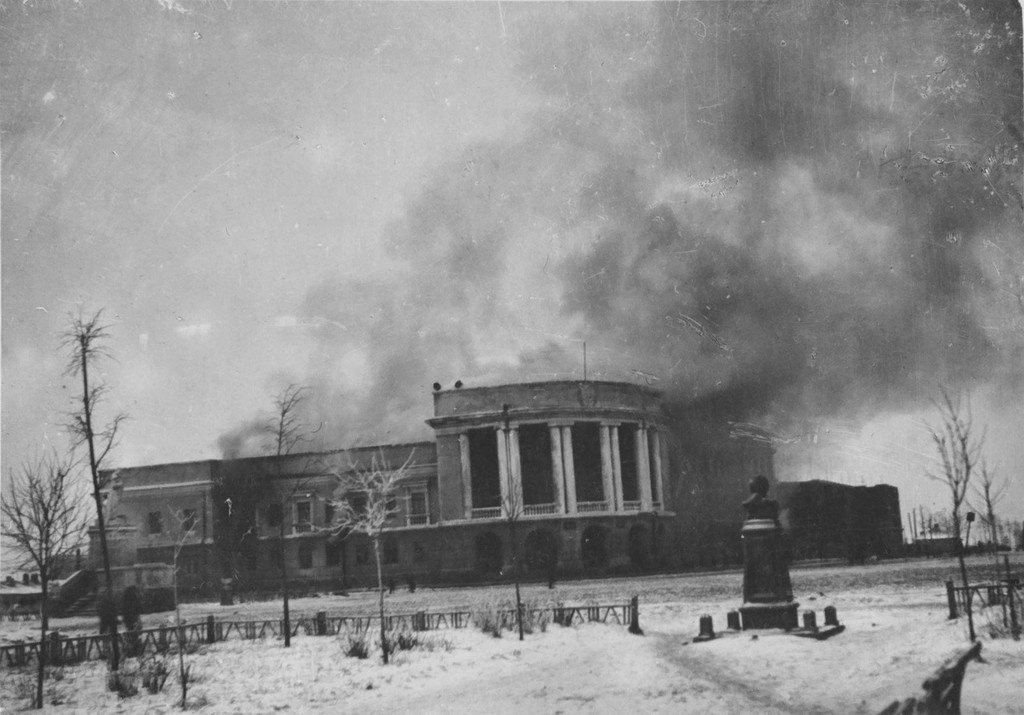 «Всю ночь в доме не спали. Уже рассвело, но никто не снимал светомаскировочных ставней… У зеркала сложены зеленые мешки с одеялами. Чего-то ждут уже давно, и готовы к отъезду. Из комнаты мамы доносятся приказы, которые слово в слово выкрикиваются в телефон. Через некоторое время после каждой такой передачи следуют выстрелы орудий, стоящих на стадионе… Видно корректируют стрельбу нескольких пушек. Пулемет стучит правее Дубового. Ему отвечает более громкими выстрелами другой пулемет, стоящий за Домом техники ,сегодня в этом здании располагается музей.