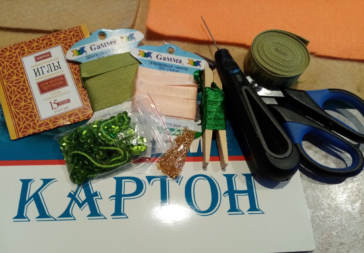 Нам понадобятся ножницы, нитки, иглы, 4 листа картона, 2 кусочка фетра размером 150*35 см, бязь, клеевой пистолет, карандаш, сантиметровая лента, обложки для тетради, ленты, бисер и пайетки для украшения. Вы можете добавить