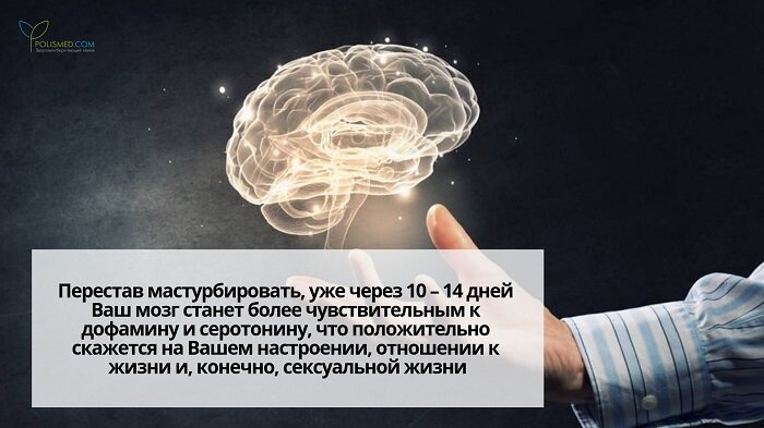 Перестав мастурбировать, уже через 10 – 14 дней Ваш мозг станет более чувствительным к дофамину и серотонину, что положительно скажется на Вашем настроении, отношении к жизни и, конечно, сексуальной жизни.