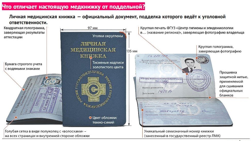 - ·подлинная медкнижка идет с красновато-розовой голограммой округлой формы, наносимой поверх фотоснимка владельца. В подделках применяется голограмма в виде квадрата;