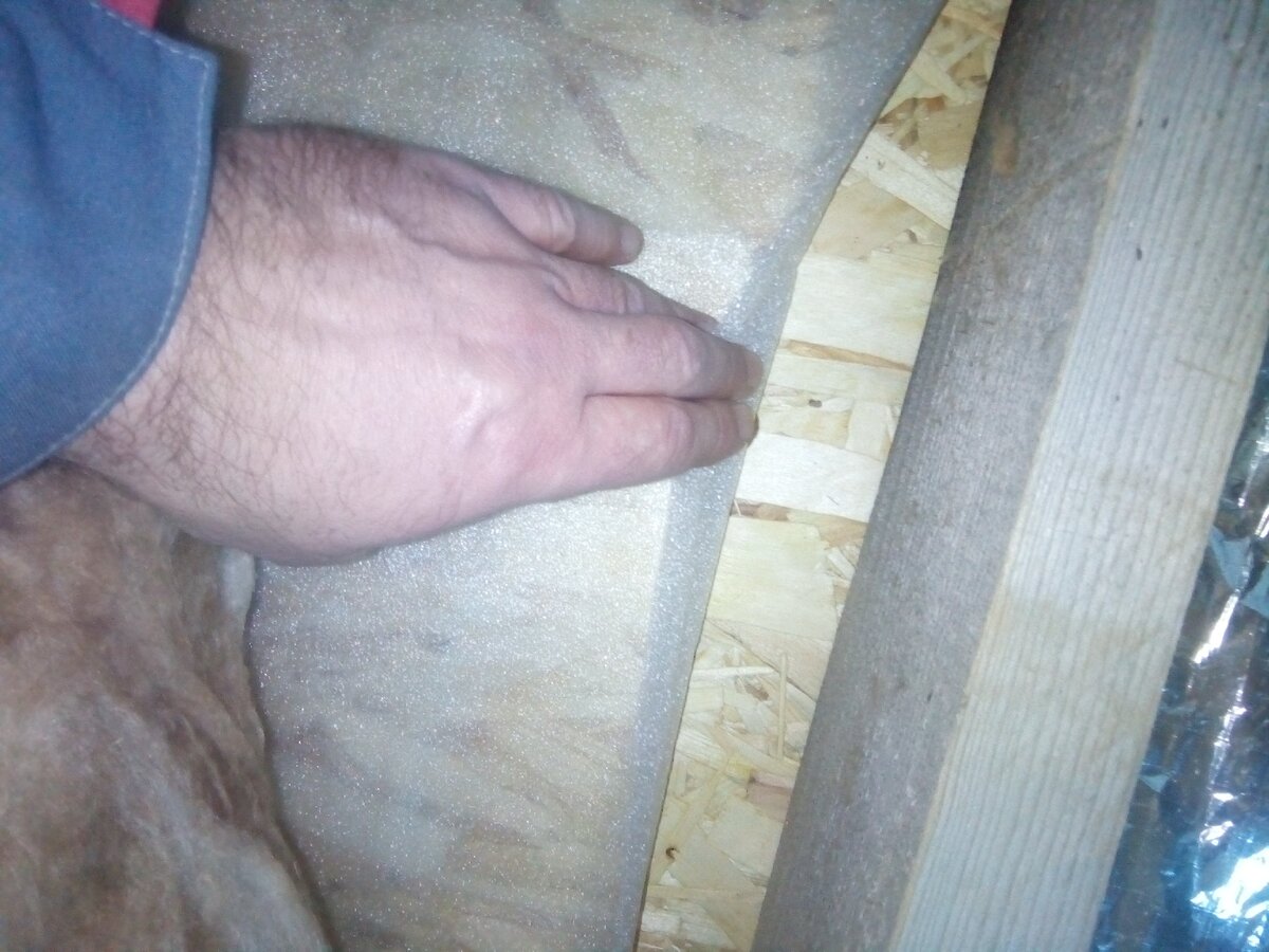 Сверху, между лагами постелил пенополиэтилен 3мм, он послужит как гидроизоляция и как дополнительное утепление. На пенополиэтилен уложил каменную вату покрытую фольгой.