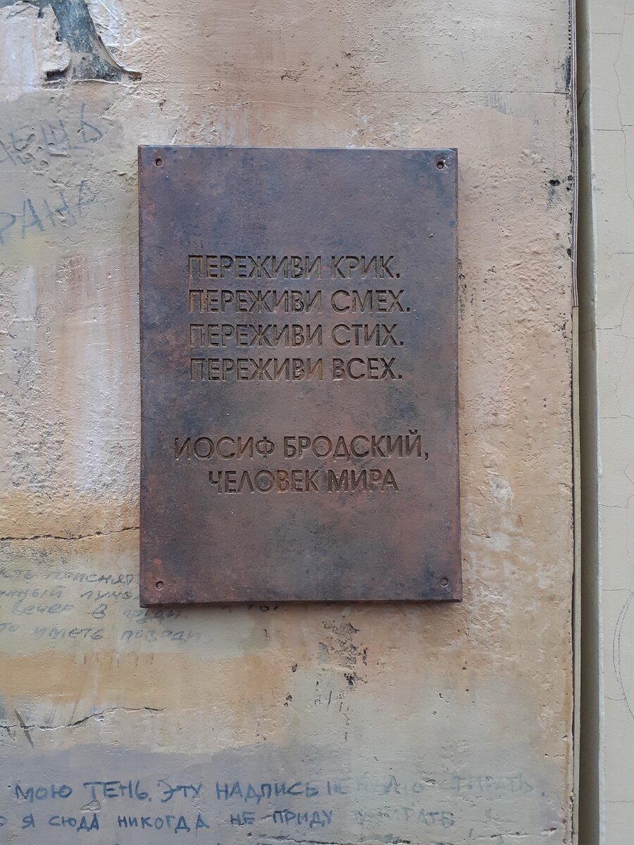 Внутри оказываешься в небольшом дворе, скорее сквере, где сделан удивительный музей Бродского на открытом воздухе. Музей в виде стены. Удивительный музей. Удивительно точный музей.