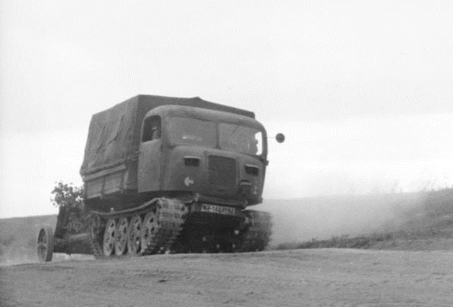 Водитель тягача с большим опытом, тоже остался жив. Тягач просто отличный! Удивительно проходимый и надежный. Поломок практически не было. Только башмаки периодически меняли. Вот и при наступлении к Днепру излюбленным приемом врезались в колонны отступающих немцев.