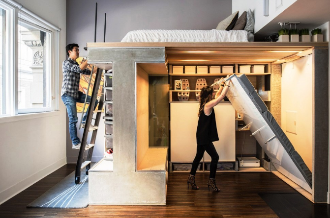 - Если возникает проблема со спальным местом, ее легко можно решить, подняв ее на второй уровень. Это выиграет много пространства, и опять-таки сделает интерьер особенным.