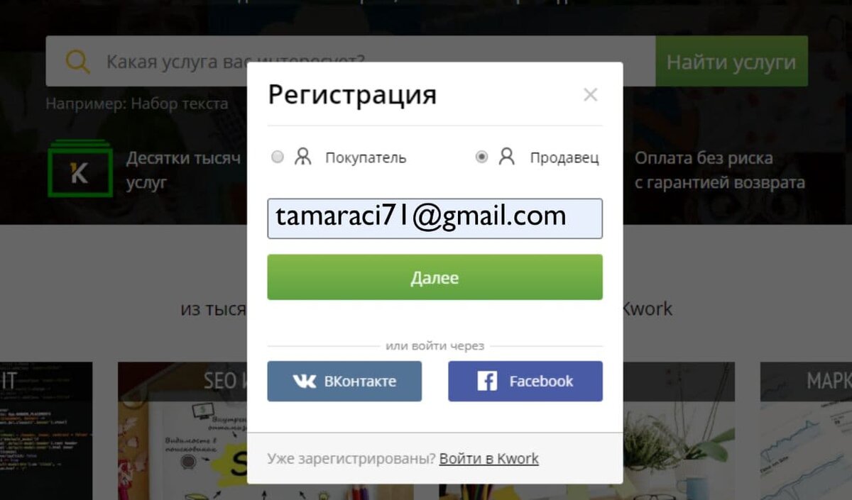 На этом сервисе регистрация очень простая. Нажимаем Регистрация, выбираем в качестве кого Покупатель или Продавец (потом вы все равно сможете использовать аккаунт для обоих ролей), пишем Емейл или регистрируемся через VK или Facebook.
