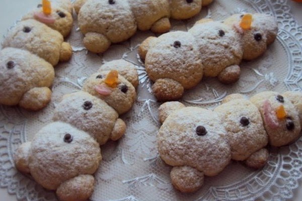 - Скатать из теста три шарика разного диаметра, соединить их, прикрепить шарики-ножки и шарики-ручки, а на голову–ведерко, уложить печенье «Веселые снеговики» на противень, выстланный пергаментной бумагой. Сделать из шоколадных капель глаза и пуговицы на туловище, выпекать 25 минут при температуре около 200 градусов. Готовое печенье присыпать сахарной пудрой, сделать из мармелада снеговикам носы.