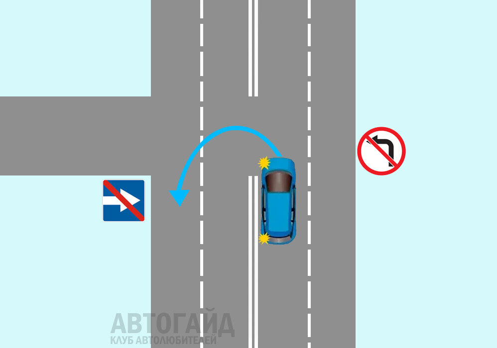 От автолюбителей с большим да и маленьким стажем можно услышать весомые рассуждения: разворот это как двойной поворот налево. А раз висит знак, запрещающий поворот, то разворот - более опасный маневр на дороге тем более запрещён! С другой стороны, в ПДД есть знак, запрещающий конкретно разворот - 3.19 , но в нашей задачке он отсутствует. Значит развернуться синей машине всё таки можно?