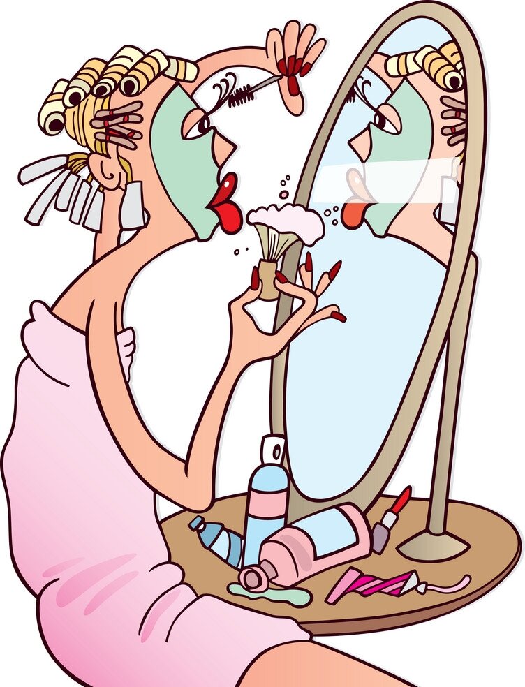 А волосы расчесать, а подкраситься. Нет, не вечерний макияж, конечно, а элементарно крем, тоналка, румяна.