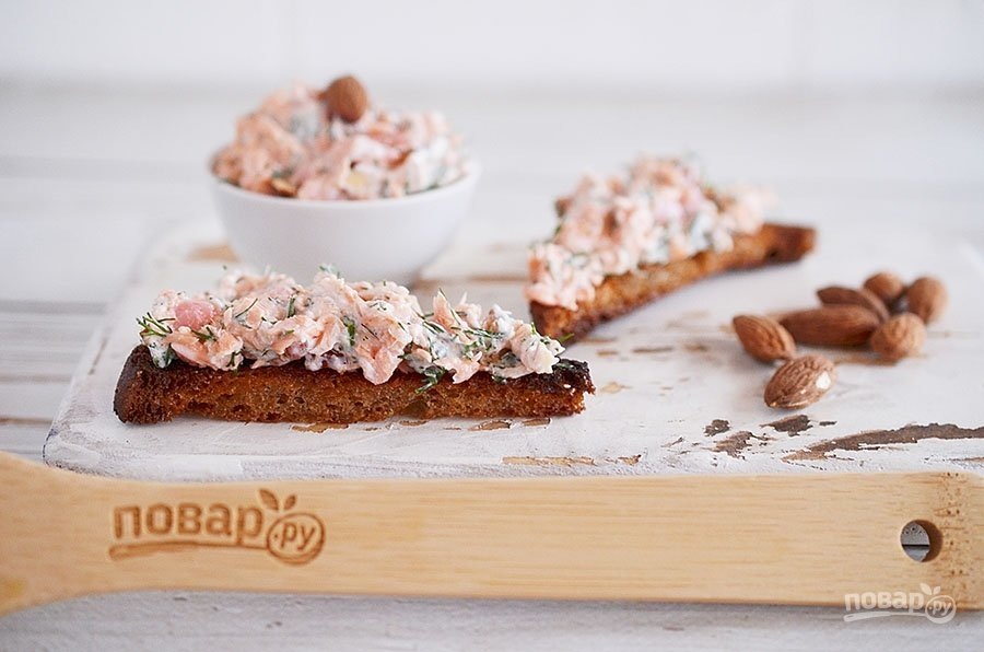 Такую закуску рекомендуем использовать, как намазку на хлеб, сухарики или крекеры. Отличное блюдо для фуршета. Изысканная закуска состоит из вареной и соленой красной рыбы, миндаля, творожного сыра.
