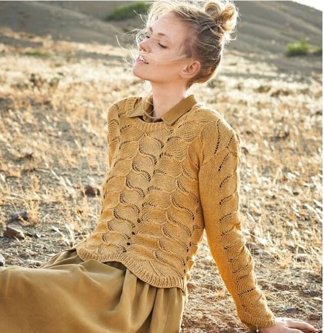 Прелестный джемпер с удивительным узором в виде листьев и волнистым нижним краем обращает на себя внимание с первого взгляда.