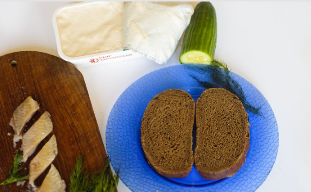 Исходные продукты: черный хлеб, мягкий сыр, огурец, пучок укропа, кусочки сельди.