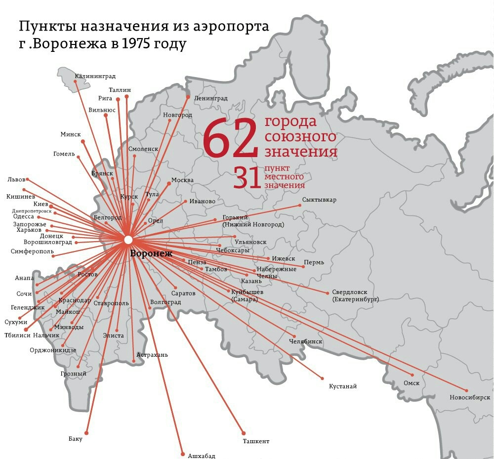 Из Воронежа в 1975 году можно было напрямую улететь в 62 города союзного значения: от