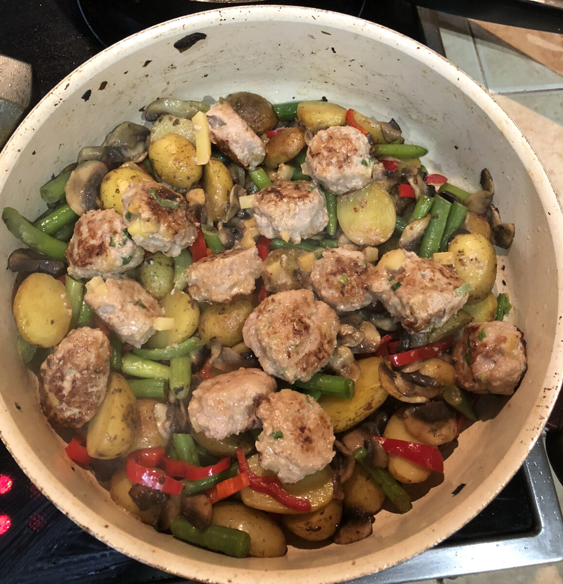 В это время на другой сковороде поджарить котлетки на растительном масле. Картошку с грибами жарить до полуготовности грибов, добавить фасоль перемешать, через пару минут добавить сладкий перец. Перемешать и добавить котлеты, ещё раз перемешать и добавить немного 🤏 воды или бульона.