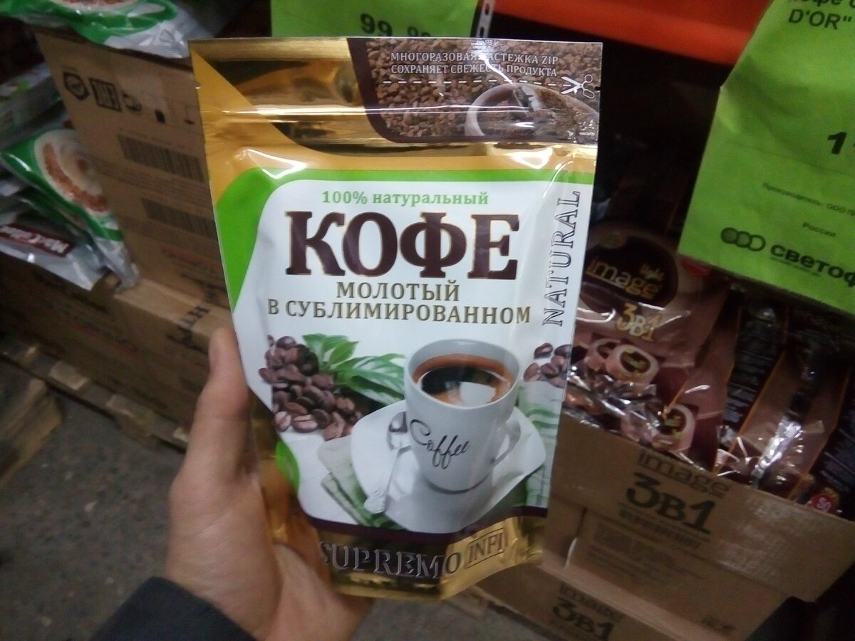 Приветствую Вас уважаемые читатели моего канала! В магазине "Светофор" очень большое разнообразие как молотого кофе, так и растворимого. И цена на кофе довольно приемлемая в "Светофоре", на мой взгляд. Но у меня постоянно возникали сомнения по поводу качества этих напитков, потому-что цена уж слишком привлекательная. И для того, чтобы убедиться в качестве одного из представленных в "Светофоре" кофе, я купил одну упаковку сублимированного кофе. Цена кофе в торговом зале магазина "Светофор". До начала эксперимента, я ознакомился с тем, что было написано на упаковке кофе. И на упаковки производитель написал, что кофе полностью натуральный, сублимированный, с добавлением молотого кофе. Состав кофе указанный с обратной стороны упаковки: Натуральность кофе я буду определять с помощью обычной холодной воды и в качестве примера заменителя кофе, я возьму второй образец - растворимый напиток "Цикорий", в котором нет добавления кофе, а в состав входит только растение цикорий. Суть метода заключ