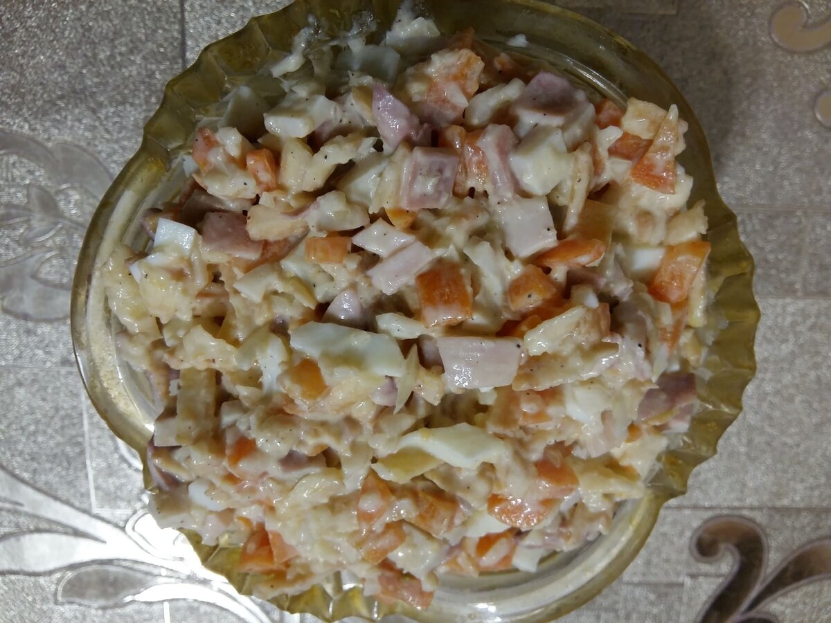 Этот салат любит готовить моя мама. Ни одно торжество или праздничное застолье не обходится без него. Компонентов немного, потому приготовить его можете за 30-40 минут. Получается вкусный, сытный и питательный салат. Из указанного количества продуктов выходит четыре порции.