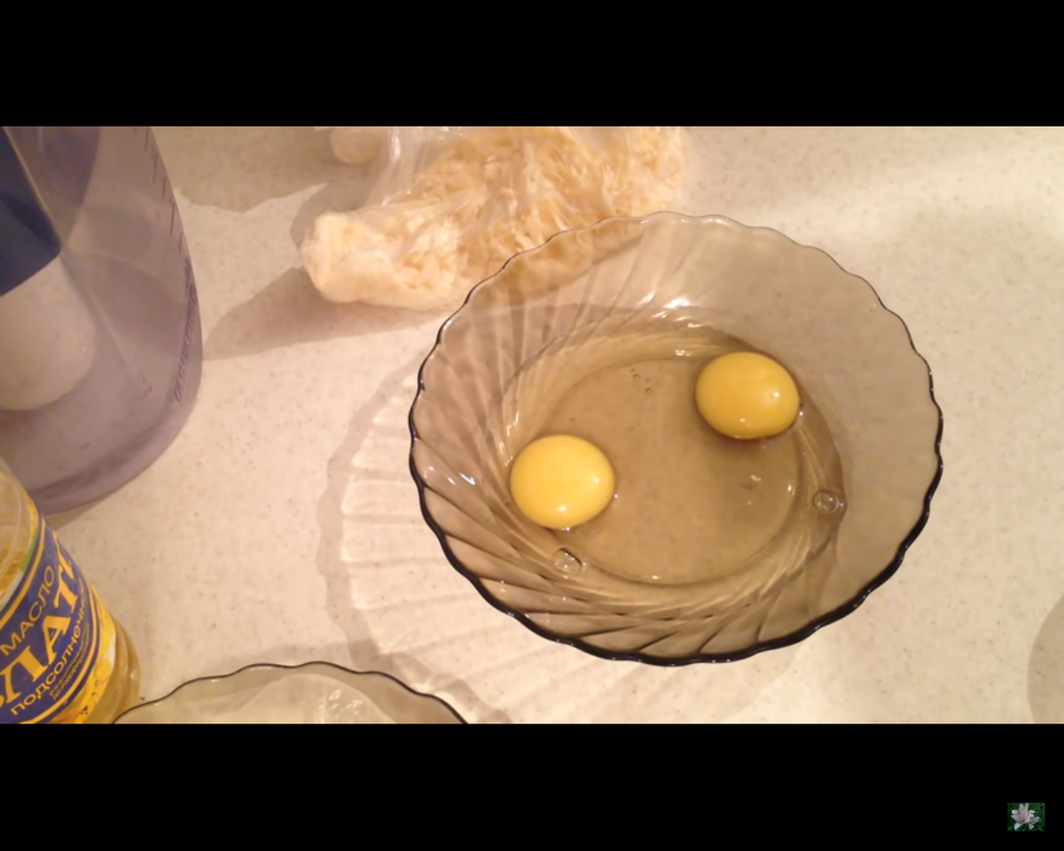 в глубокую чашку разбиваем два яйца, что бы желток разошелся, совсем немножко