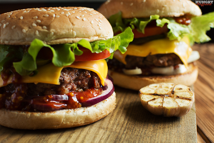 - На нижнюю часть булочки нанести ложку соуса, затем положить лист салата, говяжью котлету, кольцо свежего помидора, несколько колец маринованного красного лука, твердый сыр и жареный бекон. Любители пикантных блюд верхнюю часть булочки, которая накрывает изобилие, могут сдобрить соусом чили или любым другим.