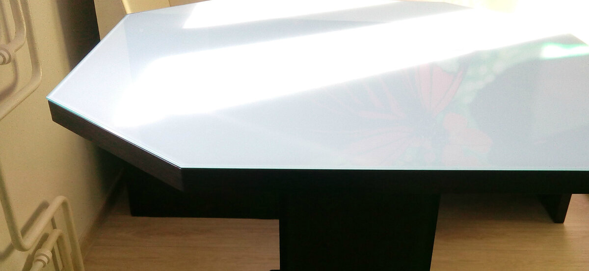 Поехали на фирму которая занимается раскроем и порезкой ДСП, много мы выслушали "комплиментов в свой адрес, вопросов, а как, а откуда Вы взяли такое" мы уехали в ожидание. Но ДСП проще чем стекло, если хоть 1 мм. мы высчитали неправильно, все наши углы будут торчать, пошли в церковь после заказа, помолились-ждем)). Прошла недели мы забрали кусочки, полоски, планочки. Вечер прошел отлично, до 2 часов ночи мы скручивали стол, трехлетний помощник все время был с нами, как такое можно пропустить ребенку. Верхняя часть стола была из стекла 6 мм., прозрачное стекло закаленное ПОКА. Утром стоял план облагородить столешницу, выбрать для нее цвет (поклеить на стекло рисунок, или однотонный цвет или оставить прозрачным) и опять тупик, если рисунок на столе, то как будет смотреться посуда белая или черная и какая она будет через год у нас.